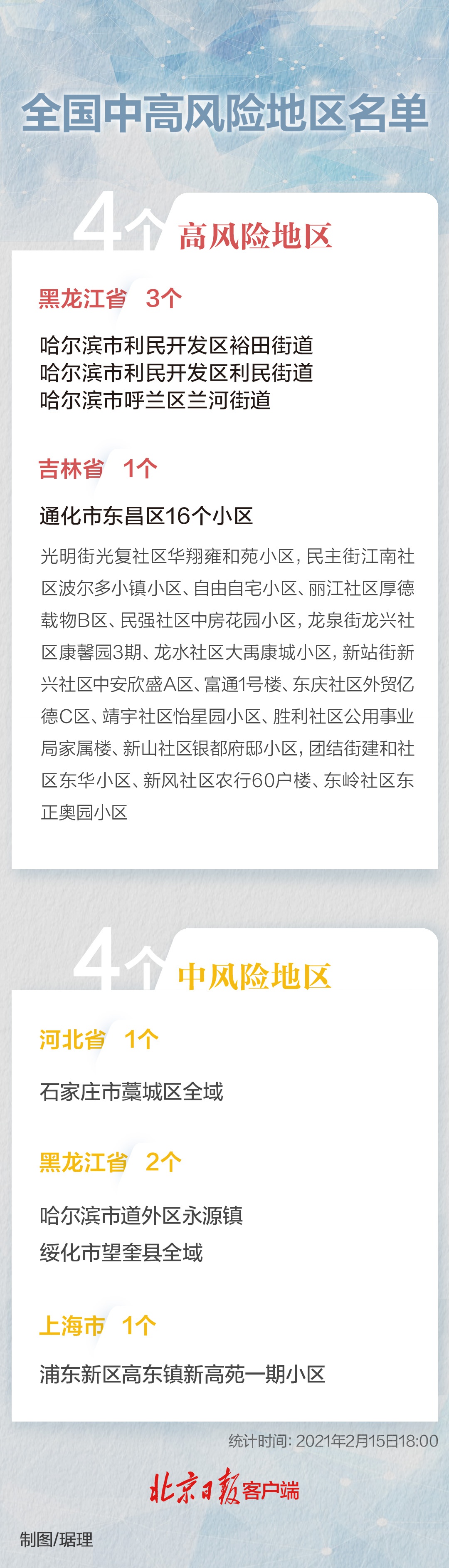 截至2月15日18:00,全国还有4个高风险地区和4个中风险地区。