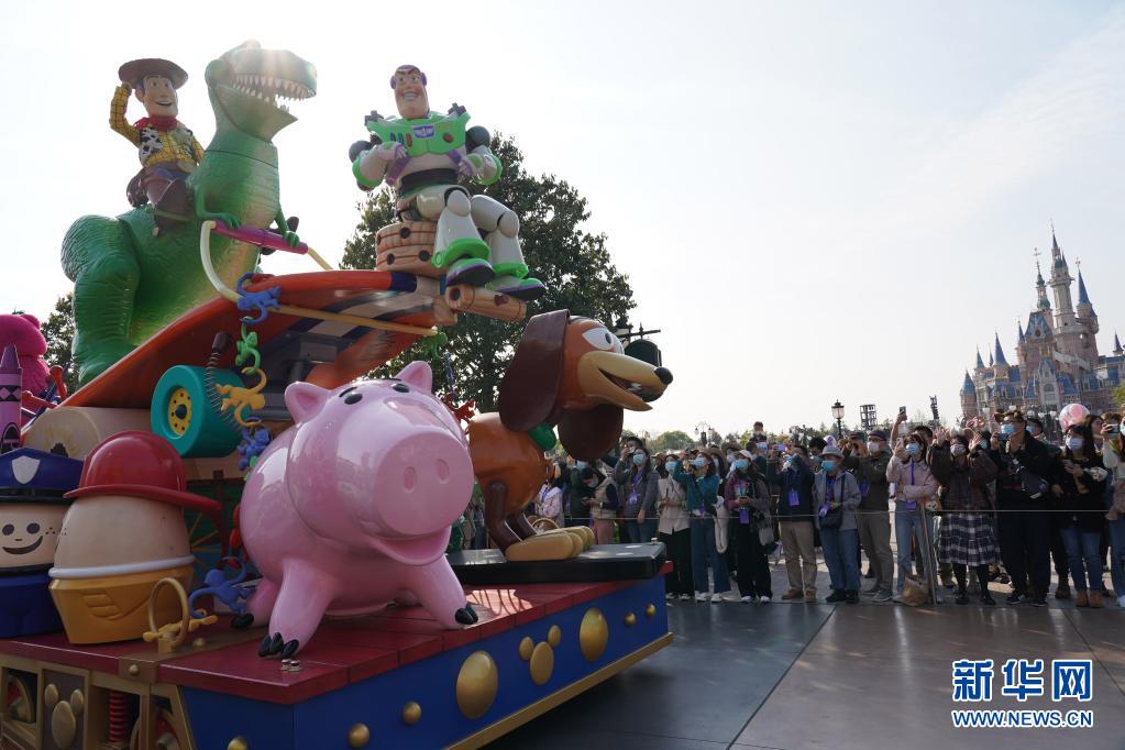 4月8日,游客在上海迪士尼乐园观看全新升级的花车巡游。当日,上海迪士尼度假区“惊喜连连,奇妙一整年”5岁生日庆典揭开帷幕。新华社记者 任珑 摄