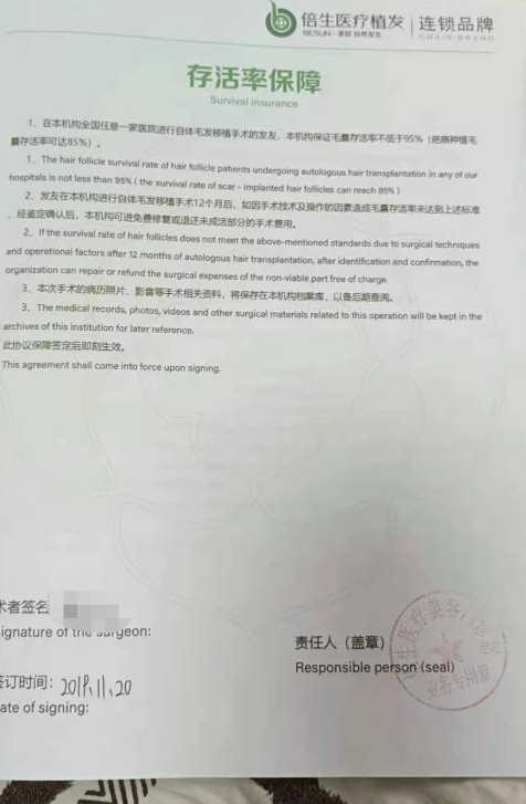 双方签署了一份《植发手术保障协议书》,这份协议书中有一项关于“存活率保障”,称“在本机构全国任意一家医院进行自体毛发移植手术的发友,本机构保证毛囊存活率不低于95%(疤痕种植毛囊存活率可达85%)。发友在本机构进行自体毛发移植手术12个月后,如因手术技术及操作的因素造成毛囊存活率未达到上述标准,经鉴定确认后,本机构可进行免费修复或退还未成活部分的手术费用。”这份协议中对毛囊存活率的保障让李诚觉得十分安心,“毕竟植发那么麻烦,最终效果是最重要的。”