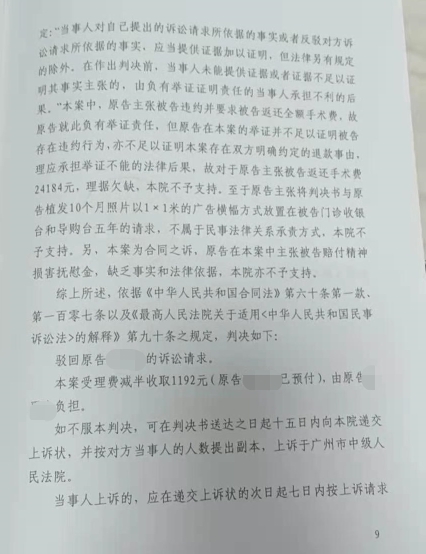 2020年12月3日,该案开庭审理。判决书显示,广州倍生医疗植发辩称“基于医疗行为的局限性,医疗服务合同具有特殊性,即医疗服务提供方无法保证医疗结果,因医疗结果受患者自身特殊体质、原发性疾病等因素影响。”