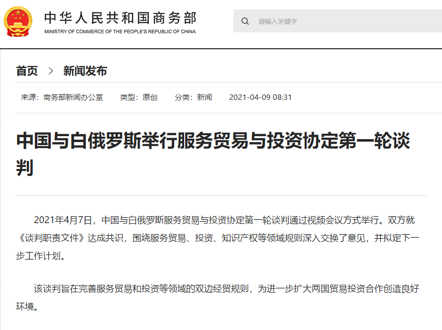 星岛环球网消息:据商务部官网消息,2021年4月7日,中国与白俄罗斯服务贸易与投资协定第一轮谈判通过视频会议方式举行。双方就《谈判职责文件》达成共识,围绕服务贸易、投资、知识产权等领域规则深入交换了意见,并拟定下一步工作计划。