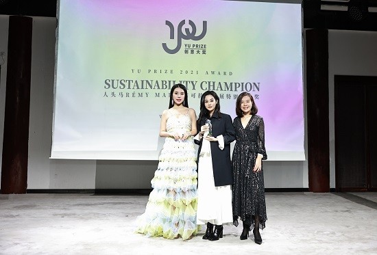 图六:Yu Holdings创投机构创始人及CEO余晚晚与The House of Rémy Martin 人头马酒庄中国区副总裁彭爽玲( Sophie Phe)共同为人头马可持续发展特别创意奖得主DONSEE10品牌创始人陈丹琪颁奖