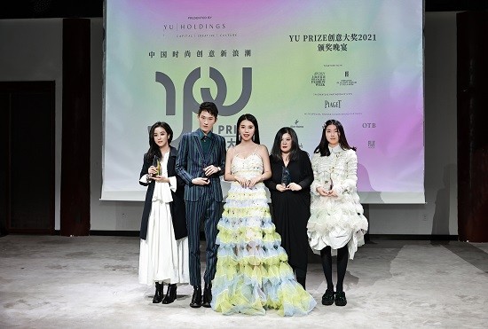 图二:Yu Holdings创投机构创始人及CEO余晚晚与YU PRIZE创意大奖2021年度大奖得主CHENPENG品牌设计总监陈鹏(左二)、伯爵创意先锋奖得主SUSAN FANG品牌创始人方妍楠(右一)、人头马特别创意奖得主DONSEE10品牌创始人陈丹琪(左一)、YUMEE瑜幂创意奖得主AT-ONE-MENT品牌创意总监黄婉冰(右二)