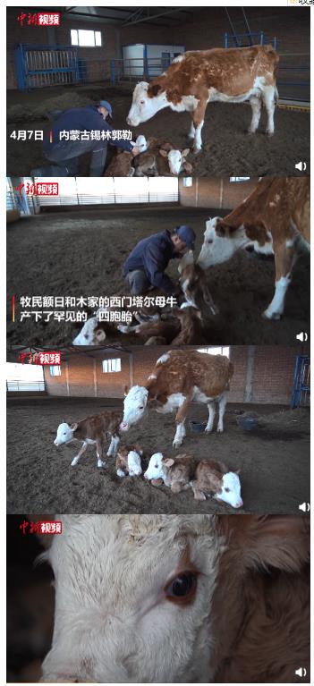 4月7日,内蒙古自治区锡林郭勒盟正蓝旗牧民额日和木家的西门塔尔母牛,产下了罕见的“四胞胎”。额日和木告诉记者,牛产双胞胎常见,也听说过产三胎的,真没有听说过有产四胞胎的,当天却亲手接了四胞胎小萌牛,非常激动。