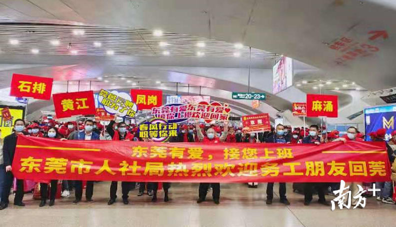 东莞市人社局联合各镇街(园区)人社分局已经早早在站台前迎接来自远方的亲人,“欢迎您回家!”同时,安排专车前往广州南站接人,由各分局直接将员工送往工作企业,实现人员接送无缝对接。