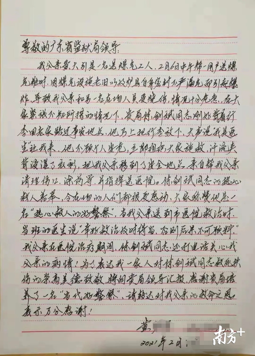 刚开年,广东省监狱管理局就收到了一封来自汕尾黄先生的感谢信。信中写道,他的父亲在春节前因煤气管泄漏不慎被严重烧伤,所幸一名警察在危急关头挺身而出、施以援手,让他的父亲及时得到专业救护。