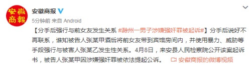 原标题:分手后强行与前女友发生关系 安徽滁州一男子涉嫌强奸罪被起诉