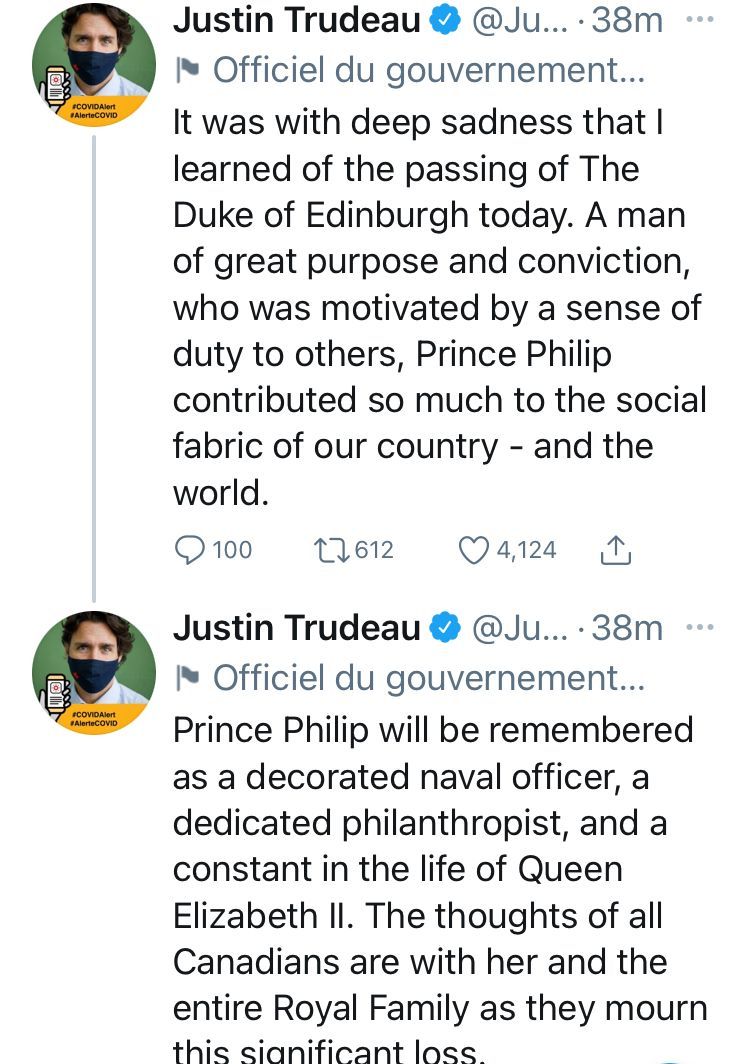 随后,他表示菲利普亲王将作为获勋的海军军官、热忱的慈善家以及伊丽莎白女王一生的配偶被人们铭记。“所有加拿大人的心都与她(女王)以及整个王室在一起,为这一重大损失而哀悼。”