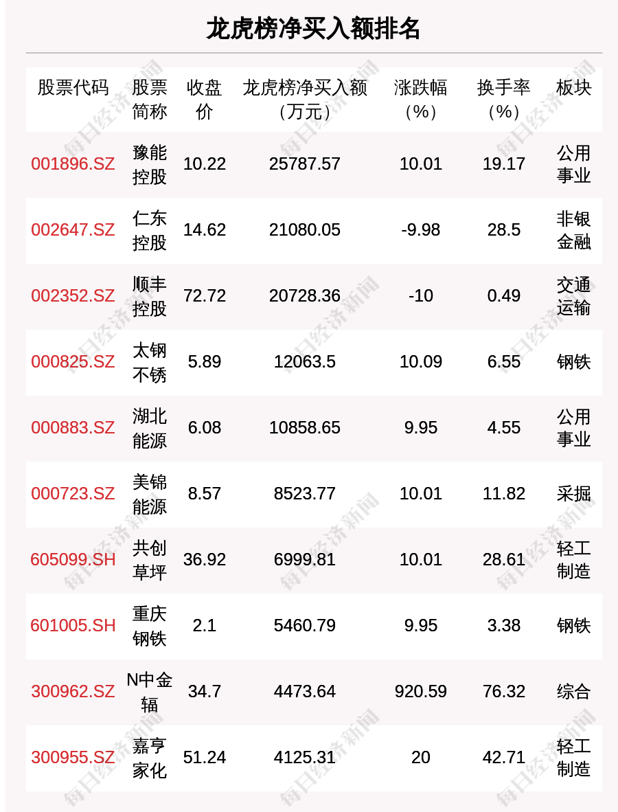 2丨整点投资 | 龙虎榜:豫能控股净买入额最多,还有27只个股被机构扫货