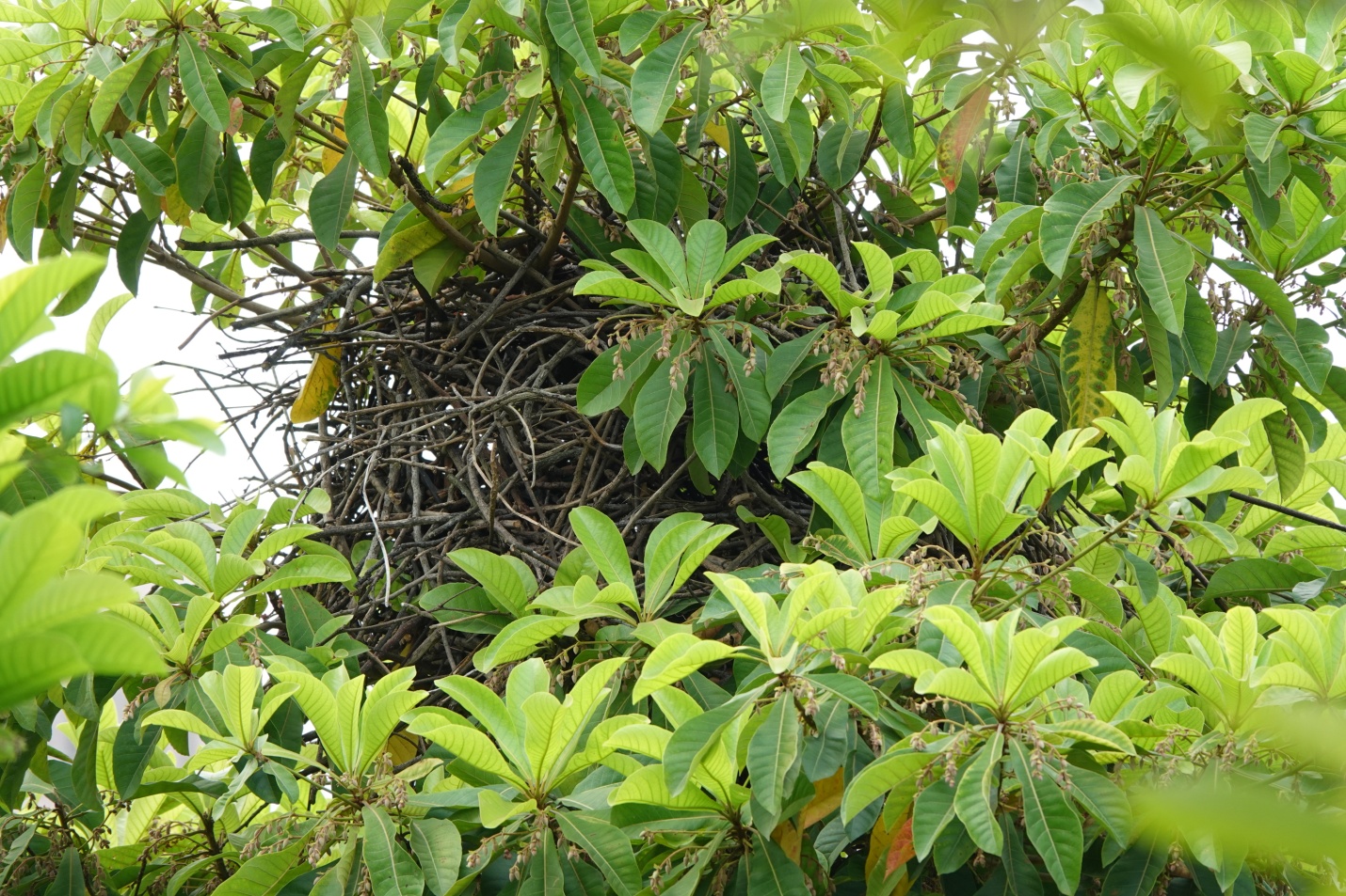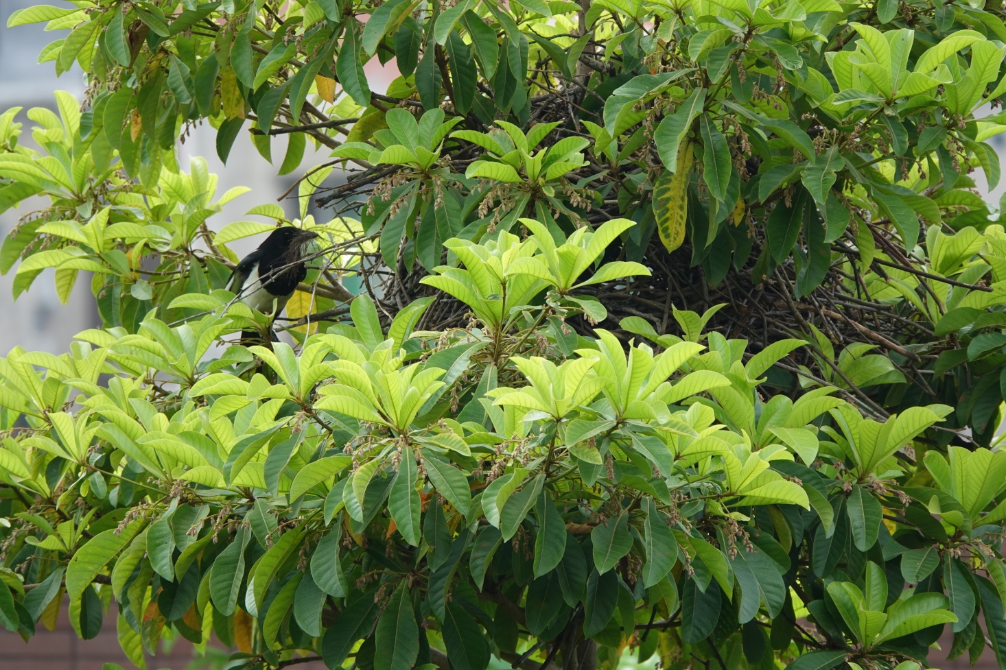 这个搭在省附读书广场的尖叶杜英树冠上的喜鹊巢,看上去庞大而杂乱,由很多树枝搭成。