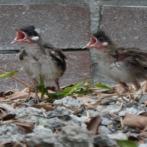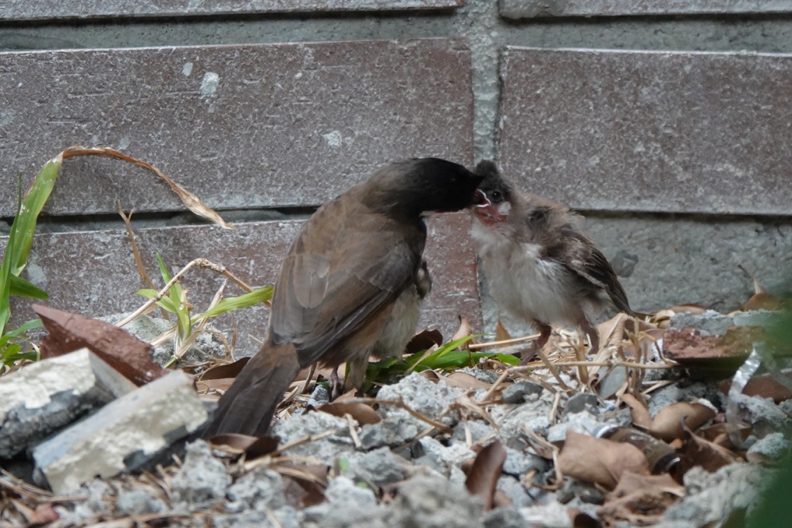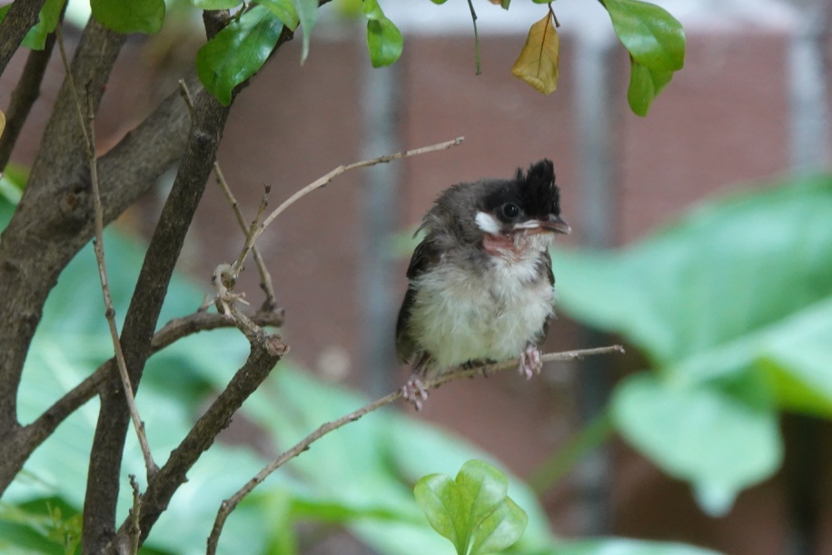 已出巢的红耳鹎幼鸟,正张开小嘴等着亲鸟来喂养