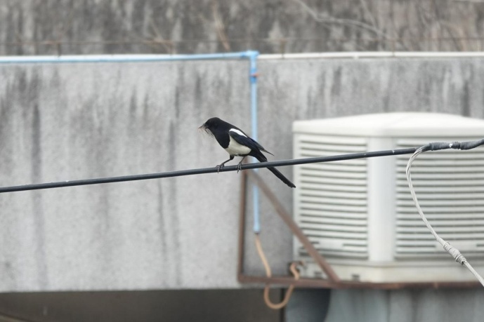 正在忙着筑巢的喜鹊,嘴里衔着软草