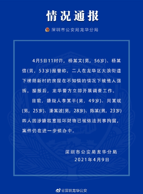 4月9日,深圳市公安局龙华分局通报“兄弟回乡祭祖房子被拆”:四人因涉嫌故意毁坏财物已被依法刑事拘留,案件仍在进一步侦办中。