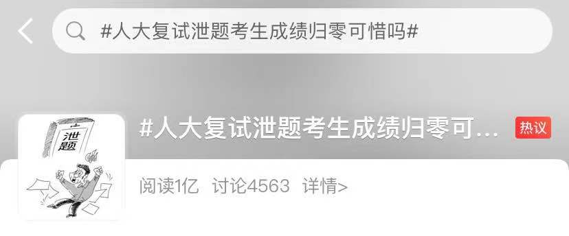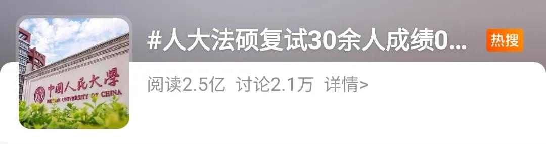 4月7日,中国人民大学法学院公示了2021年法律硕士招生考试复试成绩,多名考生成绩为0分,引发关注,相关话题也登上微博热搜。