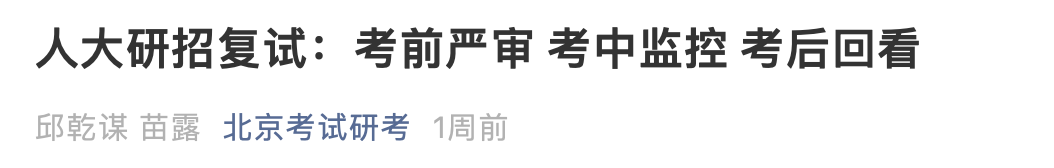 据介绍,《国家教育考试违规处理办法》和《中国人民大学2021年硕士研究生复试考场规则》等都有着极其明确严格的考场规则和考试纪律要求。《中国人民大学2021年硕士研究生复试考场规则》明确规定:“考生在复试期间不得录屏录音录像,考后不得向他人透漏招生考试内容,不得将试卷、答卷和考试内容以任何方式(微信等)转发亲属或他人。”每名考生在其签署的《中国人民大学2021年硕士研究生诚信复试承诺书》中郑重承诺:“保证复试过程不录音录像,不保存和传播复试有关内容”。