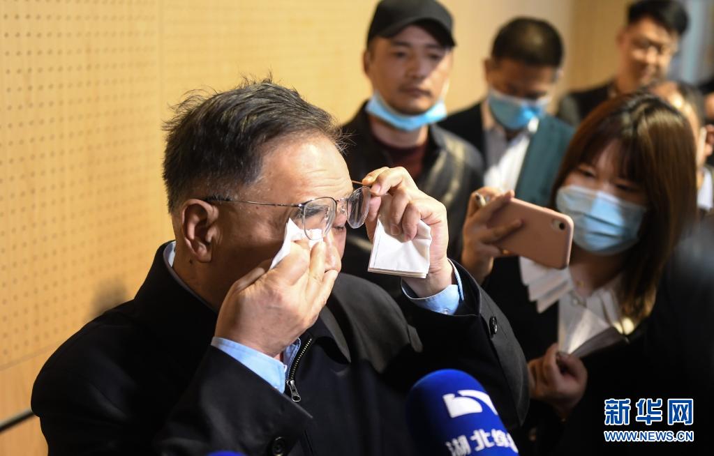 4月9日,张伯礼院士(左一)在武汉江夏方舱医院回忆疫情期间在此奋斗的历程时落泪。新华社记者 程敏 摄