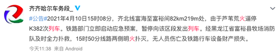 4月11日中午11时38分,@齐齐哈尔车务段 对此事进行了通报,10日15时08分,齐北线富海至富裕间82km219m处,系芦苇荒火逼停K382次列车。