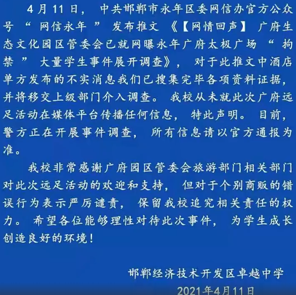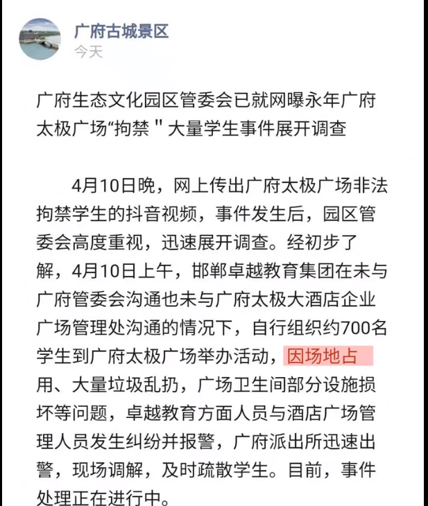 此后,景区通报称经初步了解,4月10日上午,邯郸卓越教育集团在未与广府管委会沟通也未与广府太极大酒店企业广场管理处沟通的情况下,自行组织约700名学生到广府太极广场举办活动,因场地占用、大量垃圾乱扔,广场卫生间部分设施损坏等问题,卓越教育方面人员与酒店广场管理人员发生纠纷并报警,广府派出所迅速出警,现场调解,及时疏散学生。目前,事件处理正在进行中。