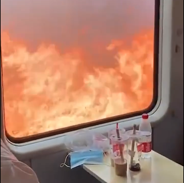 4月10日,北京开往齐齐哈尔的K382次列车,被路旁着火的芦苇荡逼停。视频中,火车道两侧燃起熊熊大火,旅客被滞留在列车上等待。