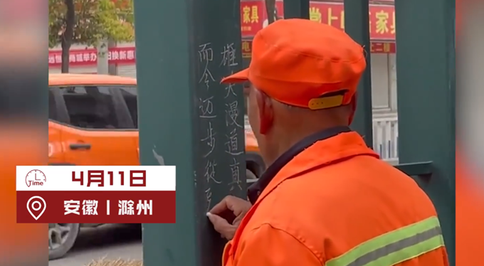 4月11日,安徽滁州定远县宋先生和女友途径一个公交站时,偶然发现一名环卫大爷利用休息时间,在站牌旁练习粉笔字!文笔流畅,字迹清秀让宋先生不禁竖起大拇指。