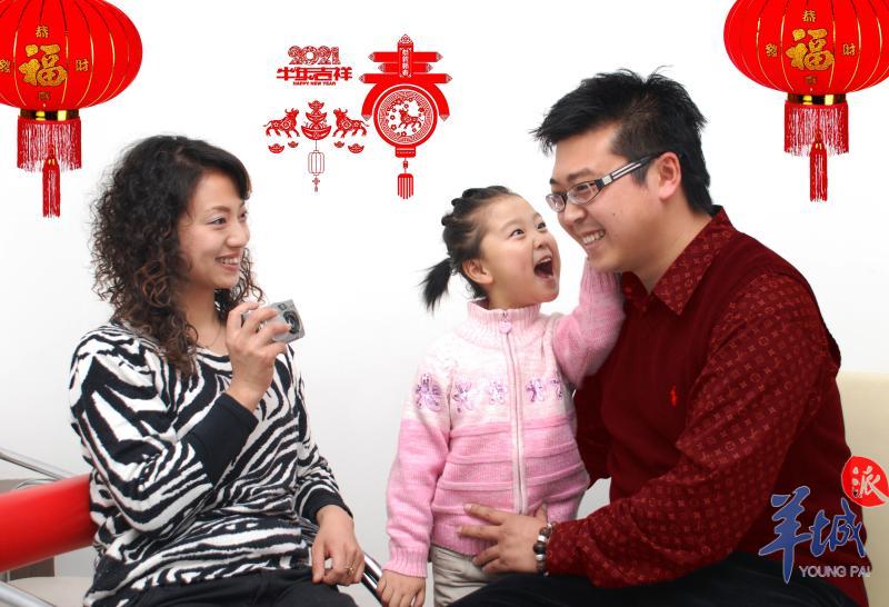 2021年2月12日,广州富力城小区里的一家乐开怀,女儿趣怪地高声向爸爸拜年。