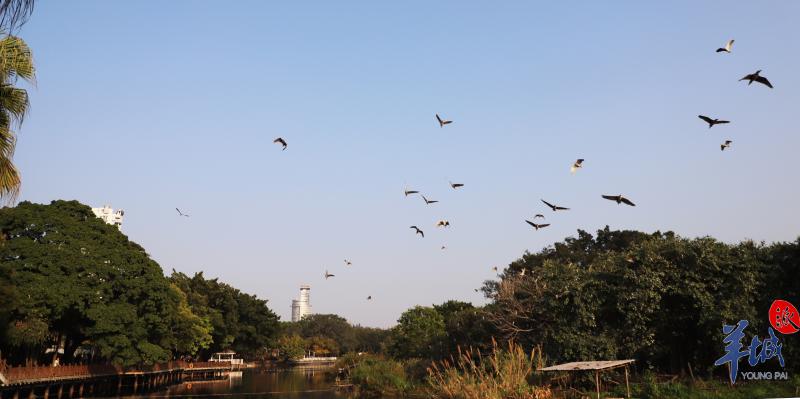 广州流花公园的鹭鸟保护区有“闹市小鸟天堂”之称,2021年2月19日,那里的鸟儿迎着阳光飞翔。
