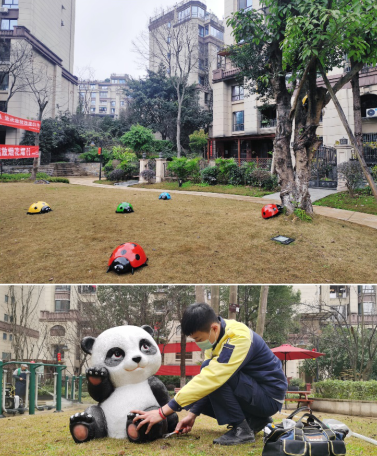 入驻当天,小区保洁团队带着高压水枪、扫帚、拖把、毛巾等工具,将小区路面、车库等地清扫干净;安全员24小时轮岗巡逻,守护业主安全;氛围灯饰点亮了整个小区,驱扫冷冬的寒意。入驻五天,小区植被补栽完成,草地上新增了憨态可掬的大熊猫、七星瓢虫等摆件,小区充满活力;车库启用了停车场智能管家“黑猫二号”,提升业主出入体验……社区迎来大变样。