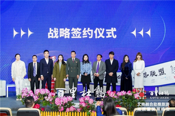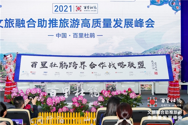 同时峰会现场良品铺子广西分公司总经理张锦锋,冷酸灵营销总监仇波,梅见品牌策划总监耿韵琦,著名时装活动策展人蒋硕,中国对外文化集团、中国对外艺术展览有限公司会展运营部总监“丝路映像 ”发起人杨贝贝,潇影集团文化产业事业部总经理邓益辉,可恩优势文化CEO张乃心,百里杜鹃文旅形象大使文化学者教授喻帆共同进行了百里杜鹃跨界合作战略签约仪式,为百里杜鹃文旅产业融合发展开启全新旅程。