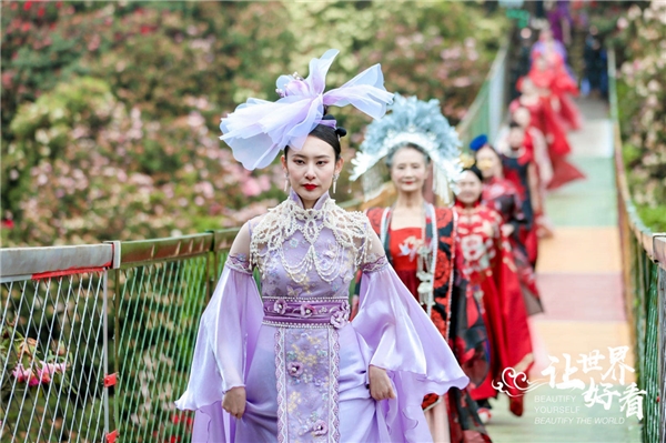 “百里杜鹃百人汉服大秀”活动现场,参加表演的百名超模年龄跨度近80岁,他们身着由著名服装设计师蒋硕设计的,传统刺绣工艺与杜鹃花相结合打造的百套汉服,一起完成了这场穿越古今的汉服大秀,将汉服的独特韵味展现给了景区的游客和观众。