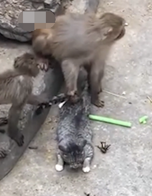 4月12日,河南新乡。游客反映,人民公园的动物园猴山上被丢进一只猫,遭到猴子追逐撕咬,且情况已持续几个月无人处理。对此,动物园工作人员回应称,猴园老鼠多,猫被从小放进去捉鼠,已适应跟猴子一起生活,游客不知情所以看上去觉得不好,园方正准备将猫放出来。