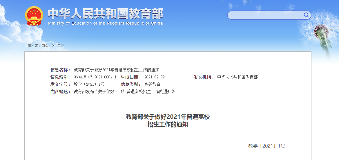 《教育部关于做好2021年普通高校招生工作的通知》全文