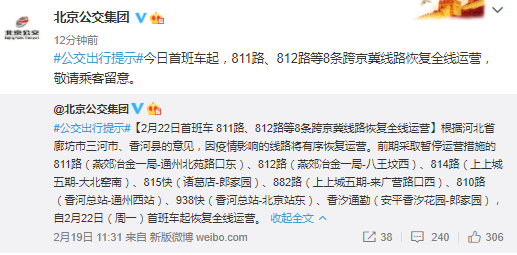 据北京公交集团官方微博消息,根据河北省廊坊市三河市、香河县的意见,因疫情影响的线路将有序恢复运营。前期采取暂停运营措施的811路(燕郊冶金一局-通州北苑路口东)、812路(燕郊冶金一局-八王坟西)、814路(上上城五期-大北窑南)、815快(诸葛店-郎家园)、882路(上上城五期-来广营路口西)、810路(香河总站-通州西站)、938快(香河总站-北京站东)、香汐通勤(安平香汐花园-郎家园),自2月22日(周一)首班车起恢复全线运营。
