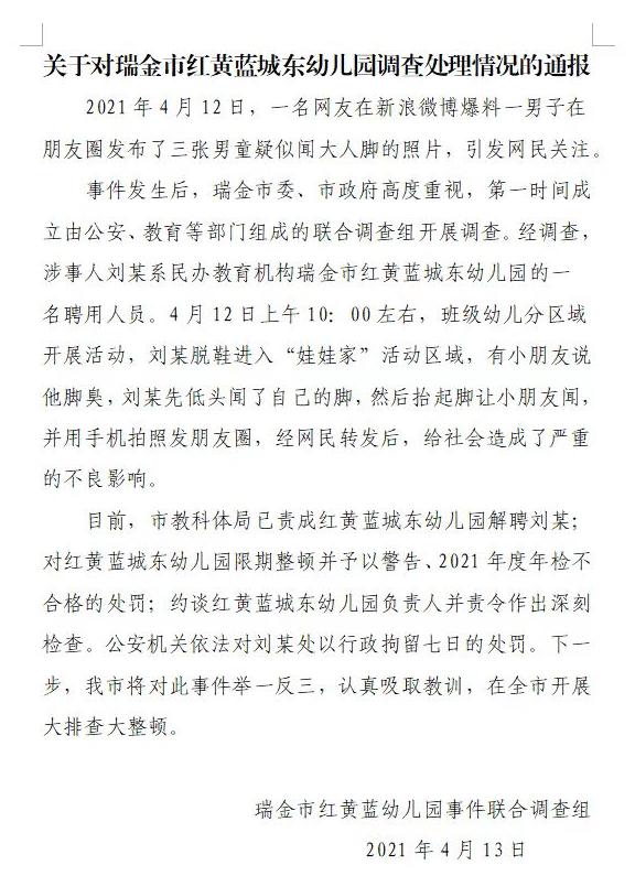 事件发生后,瑞金市委、市政府高度重视,第一时间成立由公安、教育等部门组成的联合调查组开展调查。经调查,涉事人刘某系民办教育机构瑞金市红黄蓝城东幼儿园的一名聘用人员。4月12日上午10:00左右,班级幼儿分区域开展活动,刘某脱鞋进入“娃娃家”活动区域,有小朋友说他脚臭,刘某先低头闻了自己的脚,然后抬起脚让小朋友闻,并用手机拍照发朋友圈,经网民转发后,给社会造成了严重的不良影响。