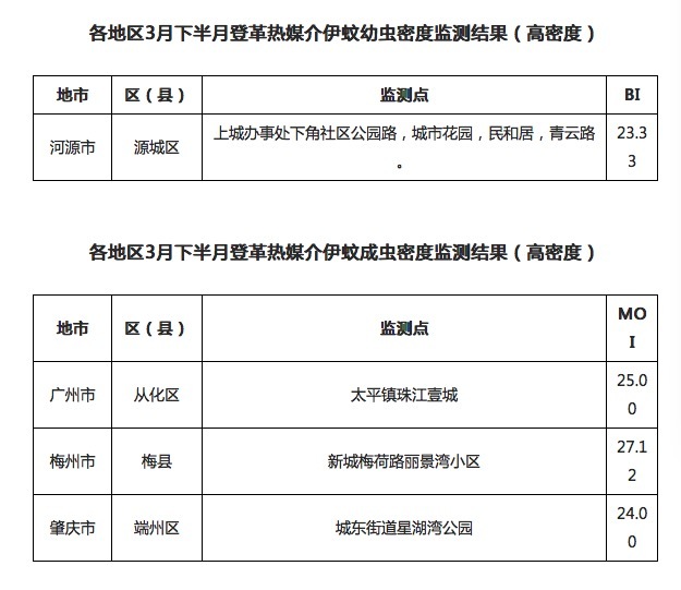 3月下半月,登革热媒介伊蚊幼虫密度监测显示高密度的监测点为河源市源城区上城办事处下角社区公园路、城市花园、民和居、青云路(BI 23.33);伊蚊成虫密度监测显示高密度的监测点为广州市从化区太平镇珠江壹城(MOI 25.00)、梅州市梅县新城梅荷路丽景湾小区(MOI 27.12)和肇庆市端州区城东街道星湖湾公园(MOI 24.00)。