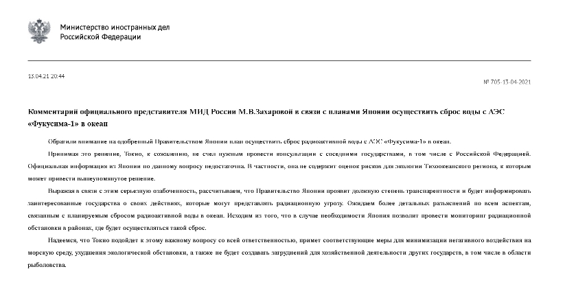 俄外交部要求日本政府负责任地处理核污水,采取适当措施最大程度地减少对海洋环境的不利影响,避免给其他国家的经济活动造成困难。