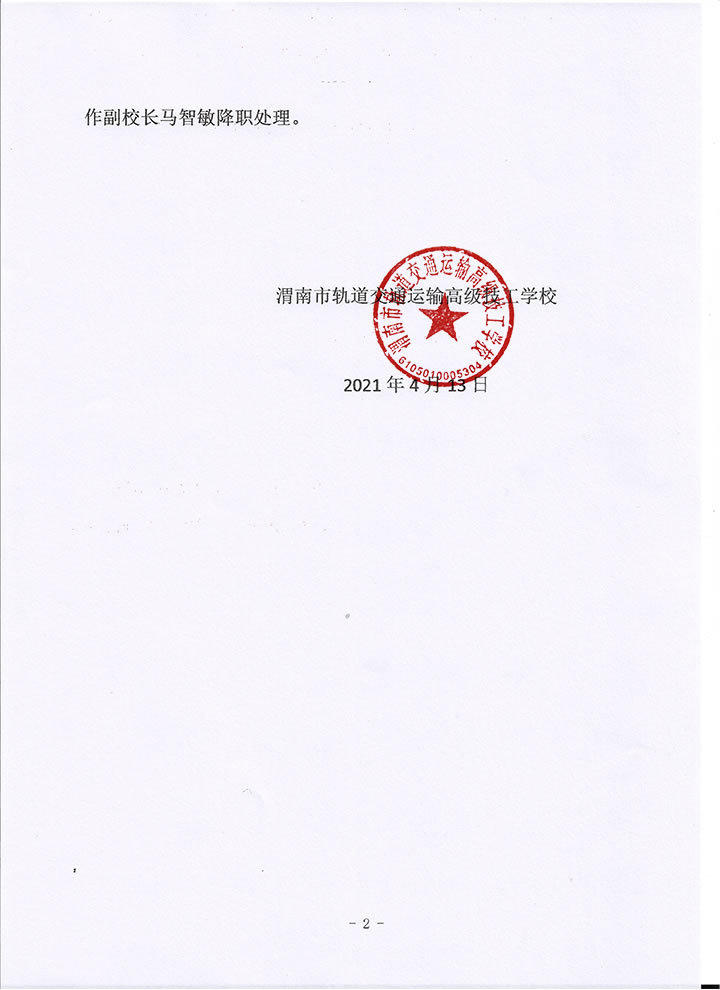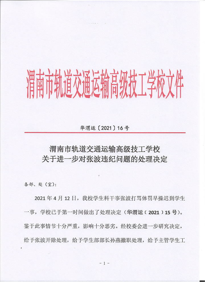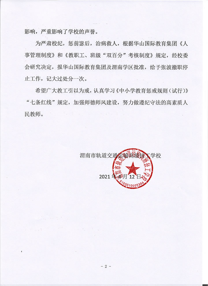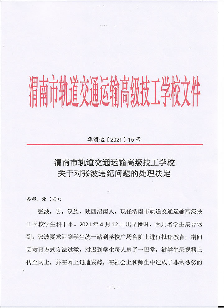 渭南市轨道交通运输高级技工学校《关于对张波同志违反校纪问题处理情况的公示》