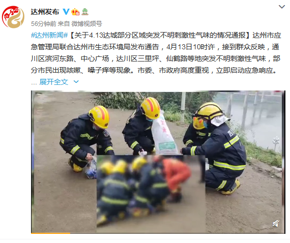 情况通报显示,达州市应急管理局联合达州市生态环境局发布通告,4月13日10时许,接到群众反映,通川区滨河东路、中心广场,达川区三里坪、仙鹤路等地突发不明刺激性气味,部分市民出现咳嗽、嗓子痒等现象。达州市委、市政府高度重视,立即启动应急响应。市、区两级应急管理、生态环境部门迅速赶赴现场,开展联合排查。