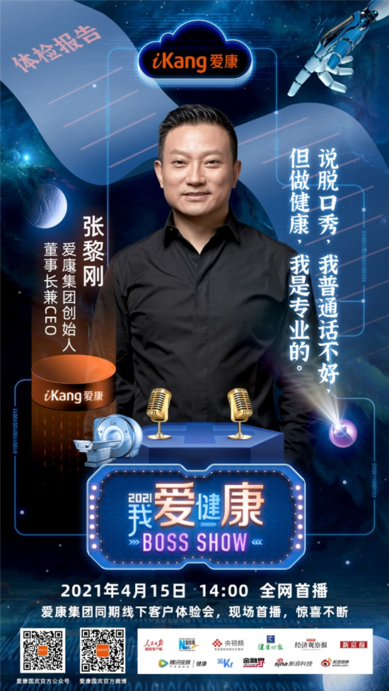 4月15日14:00,“我爱健康 BOSS SHOW”将于人民网、新华网、央视频、微博、抖音、新京报、经济观察报、健康时报、金融界、36氪、新浪科技、新浪微博等多平台线上同步首播。更多火热信息,敬请关注爱康国宾公众号及微博。