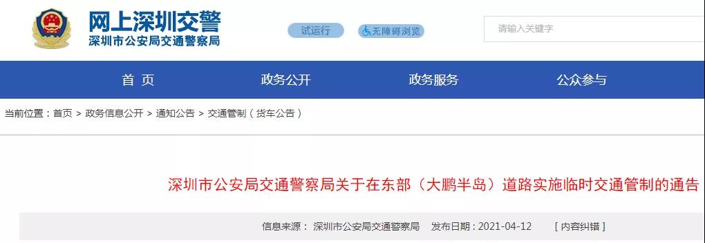 交通管制道路为大鹏新区迭福山隧道以南(含迭福山隧道)所有道路。