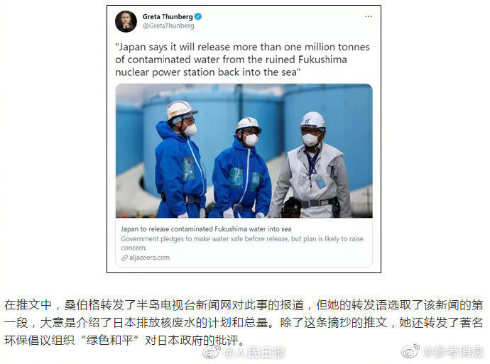 只不过,截至目前,桑伯格对日本排放核废水的发声都是在搬运别人的观点,自己没做什么表态,更谈不上提出什么实质的批评。