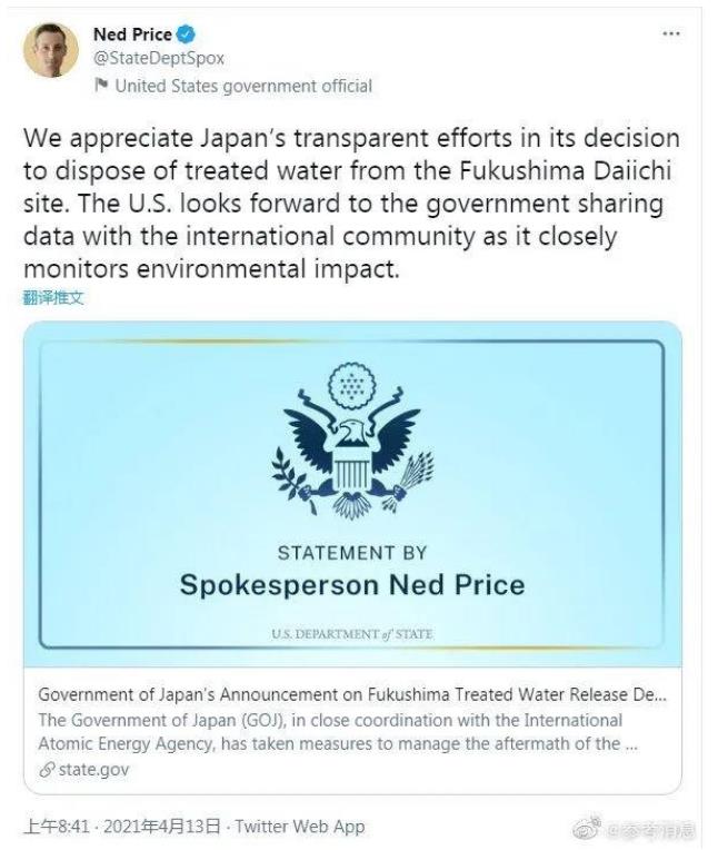 美国国务院发言人内德·普赖斯:“我们赞赏日本在决定处理福岛第一核电站污水方面所作的透明努力。在密切关注环境影响的同时,美国期待政府与国际社会分享数据。”