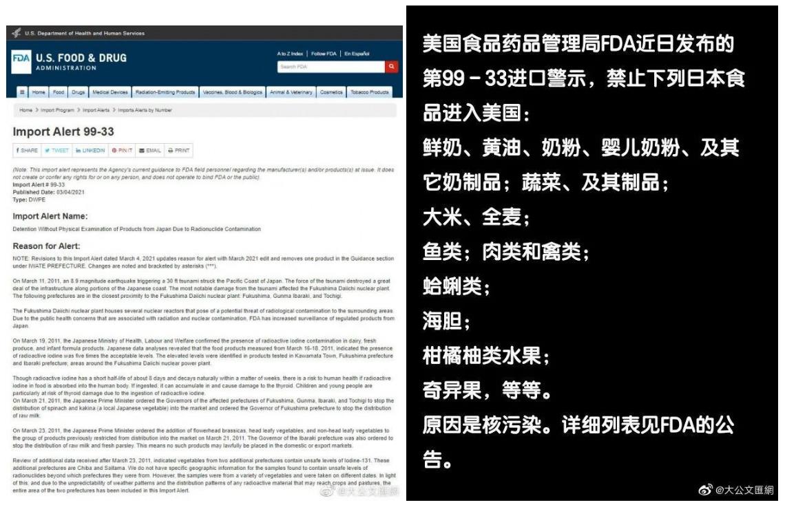 美国这些表示支持日本核污水入海的举动,俨然表现出一副“好兄弟”的模样,但美国食品药品管理局却紧跟着发布了一条关于禁止进口日本食品的警示。
