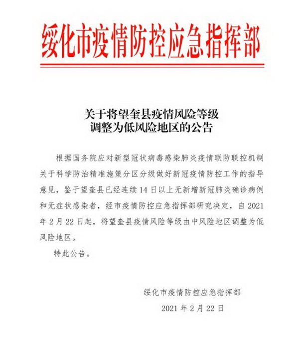 微信公号“望奎融媒之声”2月22日消息,绥化市疫情防控应急指挥部发布关于将望奎县疫情风险等级调整为低风险地区的公告。根据国务院应对新型冠状病毒感染肺炎疫情联防联控机制关于科学防治精准施策分区分级做好新冠疫情防控工作的指导意见,鉴于黑龙江绥化望奎县已经连续 14 日以上无新增新冠肺炎确诊病例和无症状感染者,经绥化市疫情防控应急指挥部研究决定,自2021年2月22日起,将望奎县疫情风险等级由中风险地区调整为低风险地区。