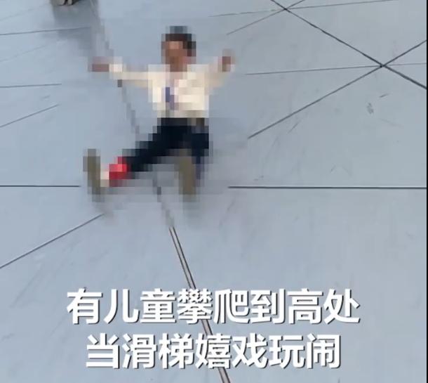 4月12日,结构顶标高153.98米,斥资1.12亿元的生命之环景观建筑吸引不少抚顺市民前来打卡,打卡同时也有不少市民带着孩子前来游玩嬉戏。但有些小朋友向高处斜坡攀爬,看上去极度危险。