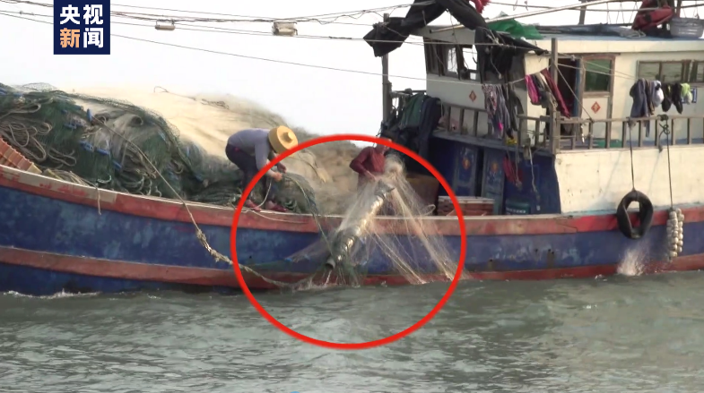 连云港渔民 程利松:放流网的时候把它钩住的,(直径)有碗口大,体积圆柱体,上面载一个浮球,下面通了一个很长的线,电缆一样。