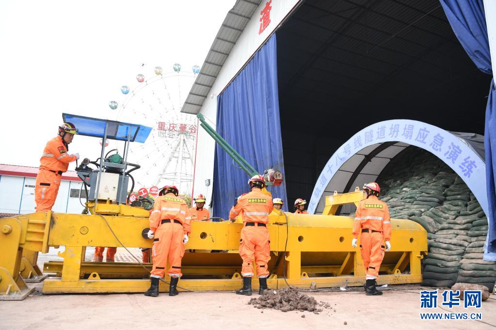 当日,重庆市2021年隧道坍塌应急救援演练在中铁十一局五公司承建的重庆轨道十八号线项目奥体中心站建设工地举行。演练模拟隧道施工时,突发拱顶坍塌、工人被困的情况,组织抢险人员和机械设备在指定时间内赶赴事故现场,实施应急救援处置。
