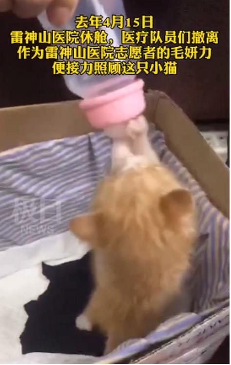 毛妍力介绍,这只小猫去年3月22日在雷神山医院附近的黄家湖畔出生,但猫妈妈不知去向。她和支援雷神山医院的医护们在医院附近散步时,发现了这只嗷嗷待哺的小猫,于是把它抱了回去,给它起名“雷神喵”,轮流在酒店里喂养它。她们用废纸箱、毛巾和尿不湿制成简易猫窝,并想方设法弄来奶瓶和羊奶,每天定时喂养。在大家的细心照料下,小猫顽强地活了下来,越长越精神,并很快成了“团宠”。它奶声奶气地呼唤,也成了医护人员们疲惫工作之余的解压剂。