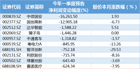 牛眼君(每经牛眼:njcjnews)统计了一下截至目前已经公布今年一季度业绩预告的上市公司及其股价在本月的表现,可以发现,以截至今日沪指本月跌幅1.25%来计算,一季度净利增幅居前的10位个股中,除了多氟多和黑猫股份外,全部跑赢沪指,基本与一季度业绩变动呈现同向变化。而一季度净利降幅居前的10位个股中,跑赢沪指的要多一只,分别是中信国安、达华智能和獐子岛,也基本与一季度业绩变动呈现同向变化。