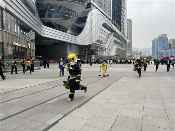 沙坪坝消防救援支队指挥中心“接警”后,立即调派三峡广场小型消防站出动9名消防指战员、1辆水罐消防车赶赴现场。演练中,按照单位自救、接警调度、人员疏散、安全防护、灾情侦查、初战控制、警戒封锁、协同处置等环节组织实施。