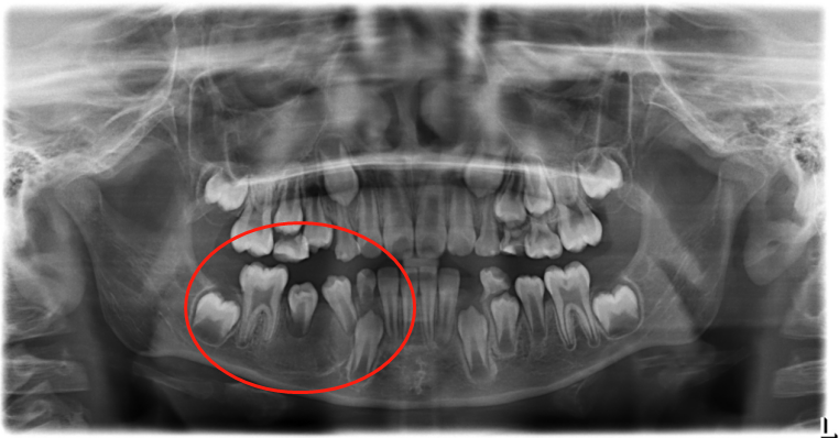 在X光片显示下,鹏鹏右下颌骨有大面积囊性阴影,而且松动的乳磨牙和未萌出的恒牙已经出现牙根外吸收的现象,如不给予治疗,囊肿有可能吸收掉整颗恒牙和部分颌骨骨质。
